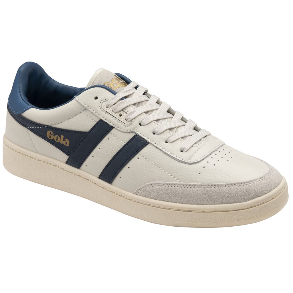 Introducing Contact Leather to the Gola Classics men’s collection. This up-styled cup sole sneaker is inspired by heritage court sports footwear and has a timeless appeal. The contrast marine blue heel tab and navy Gola wingflash trim give this new style a classic court look and complement the crisp off white leather upper. Contact Leather is a dependable sneaker choice.