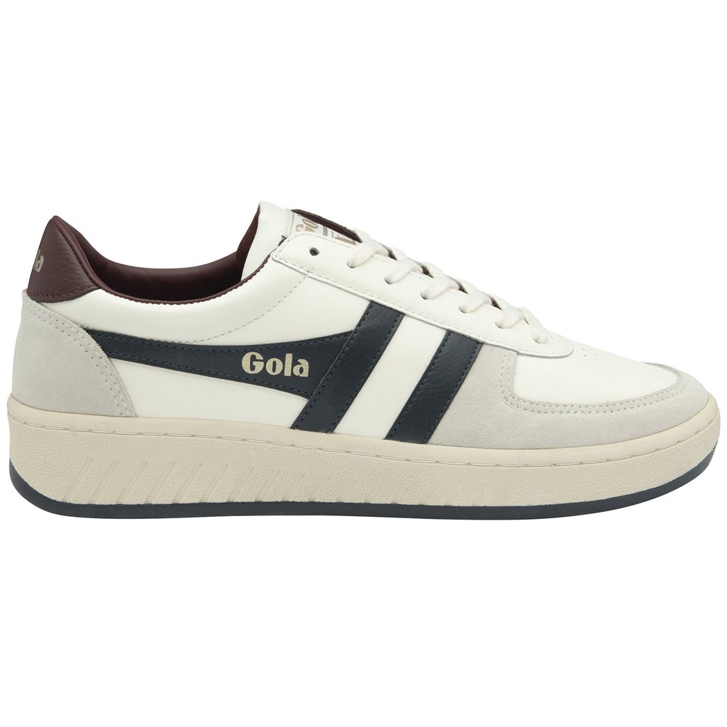 Building on from the debut of this heritage court, Grandslam Classic for men keeps true to form this season with its crisp lines but offers a subtle style elevation with the addition of contrasting Gola wingflash and heel tab colour pops in heritage tones. The off white leather upper is complemented with classic navy and burgundy and finished with gold Gola branding call outs.