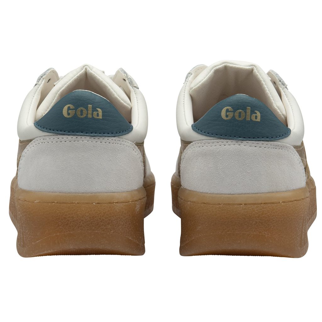 Gum soles are having a moment and Grandslam Elite takes the sneaker trending look up a notch. The much loved Grandslam vintage tennis upper is complemented with the perfect gum tone sole and a classic colour palette of white with light caramel Gola wingflash branding. A peacock heel pop adds a joyous twist to give a heritage women’s sneaker with a sunny disposition.