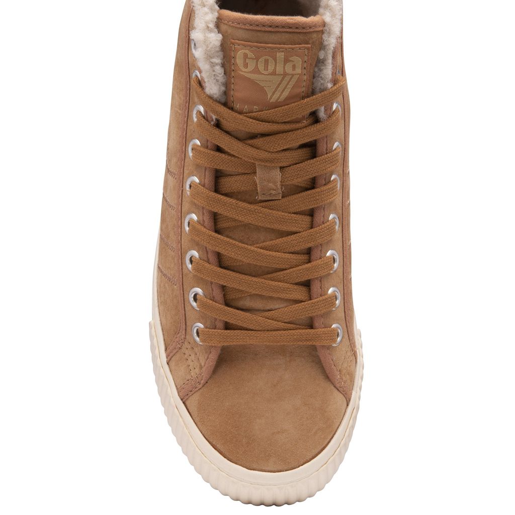 The heritage Gola Mark Cox tennis plimsoll silhouette gets a revamp this season in the form of a high top boot. Nordic High for women in light caramel suede features a season essential cleated sole and a snug fleece lining making it a great transitional trainer choice for those cooler days.