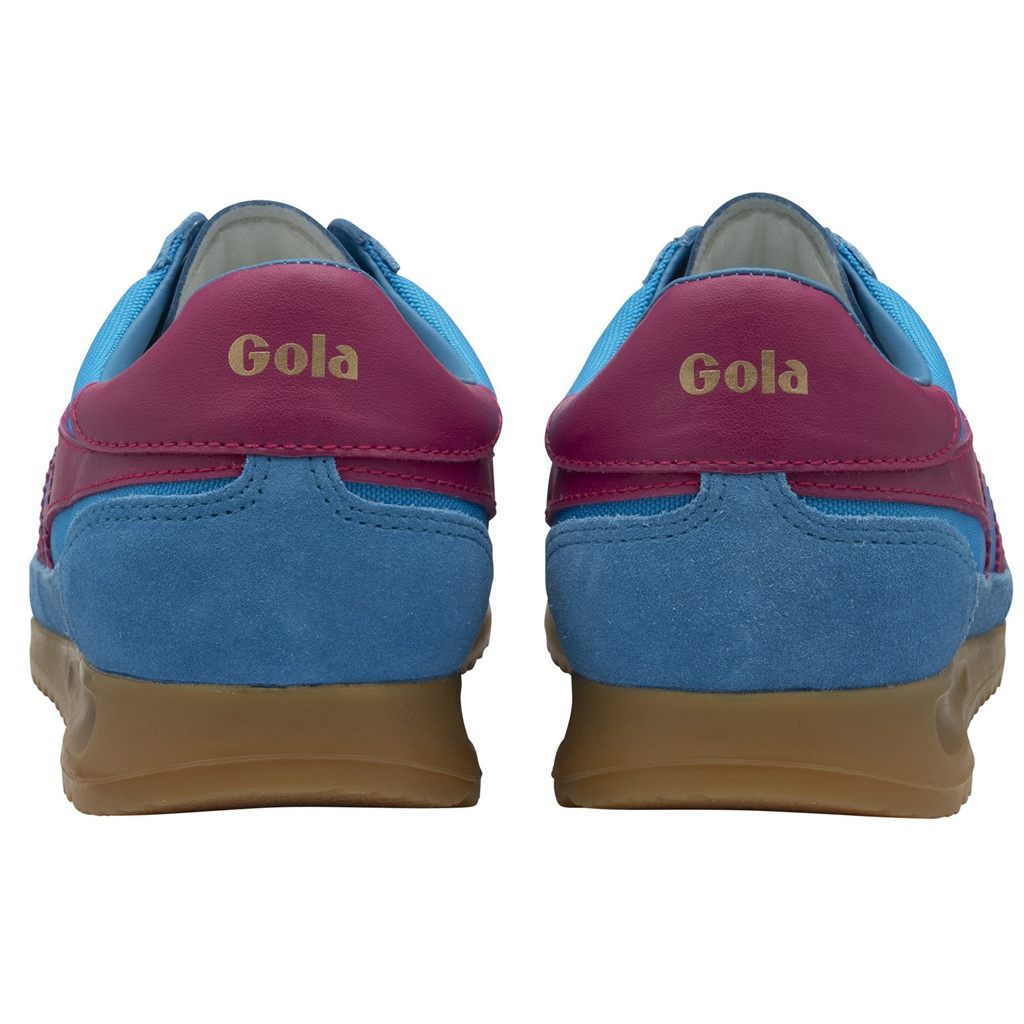 With much chatter on terrace influenced sneakers having their moment, Gola Tornado sweeps in at the speed that its name suggests. A heavy weave nylon upper in santorini is complemented with matching suede trims to the toe, heel and lace facing and contrasted with a fuchsia Gola wingflash side trim with sawtooth edges. Sat upon a slight wedge gum sole, Tornado for women offers the full old school sneaker package.