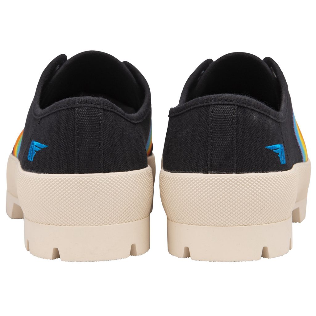 Gathering trainer fashion status at a significant pace, Coaster Rainbow takes on a transitional form for the new season in the shape of Coaster Peak Rainbow. This chunky women’s trainer silhouette pushes the styling boundaries; combining an exaggerated combat look with a trainer, seeing you through the style challenging season change. The black cotton canvas upper is teamed with Gola’s vibrant rainbow trim and contrasted with an off white midsole, making a trainer statement of grand proportions.